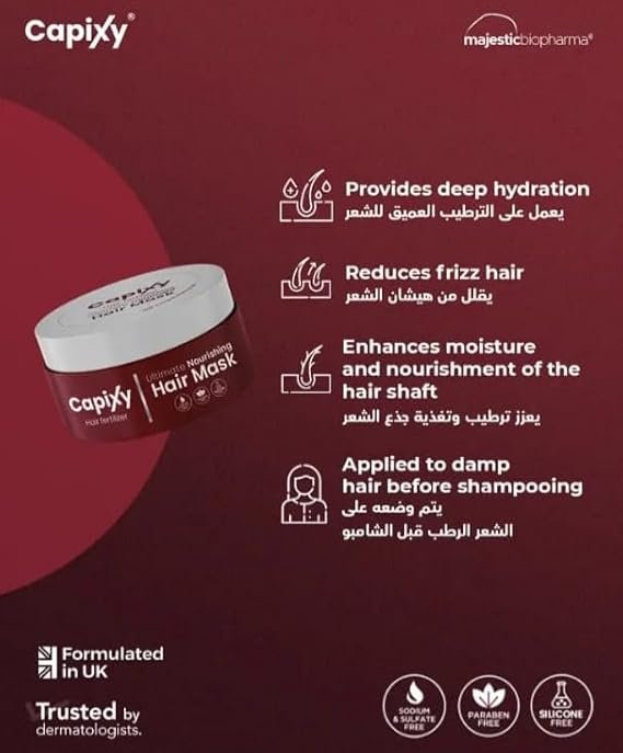 - Reduces hair loss: strengthens hair follicles and reduces shedding caused by dryness or chemical damage.