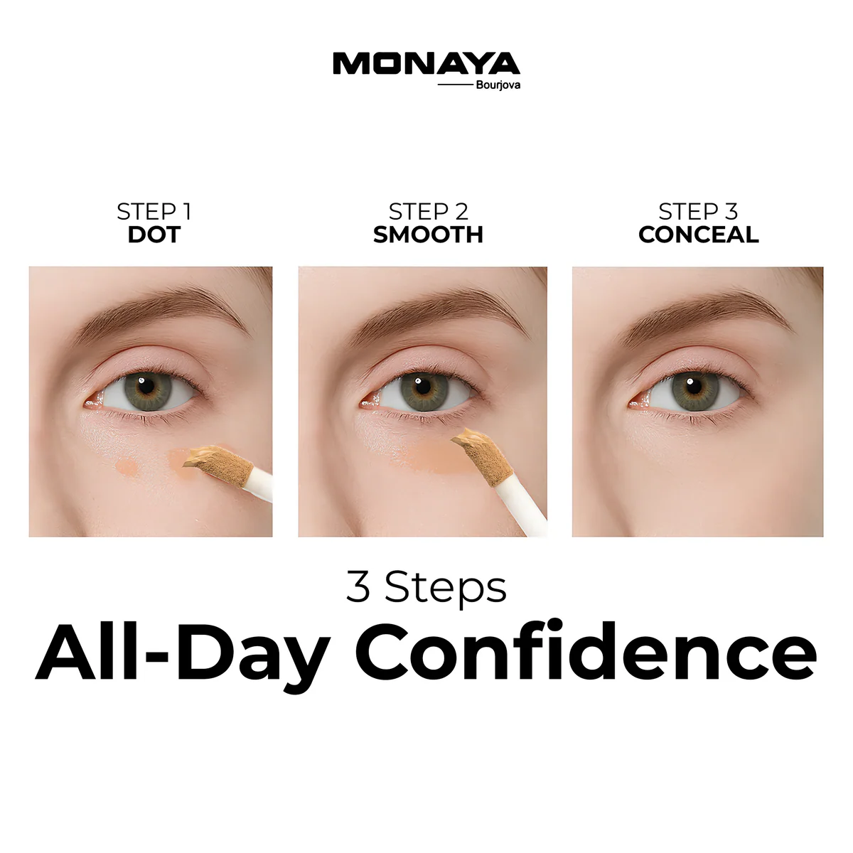 Full Coverage & Waterproof: Monaya Bourjova Full Cover Concealer provides ultimate full coverage, effectively concealing dark circles, blemishes, and imperfections, all while being waterproof for long-lasting wear.